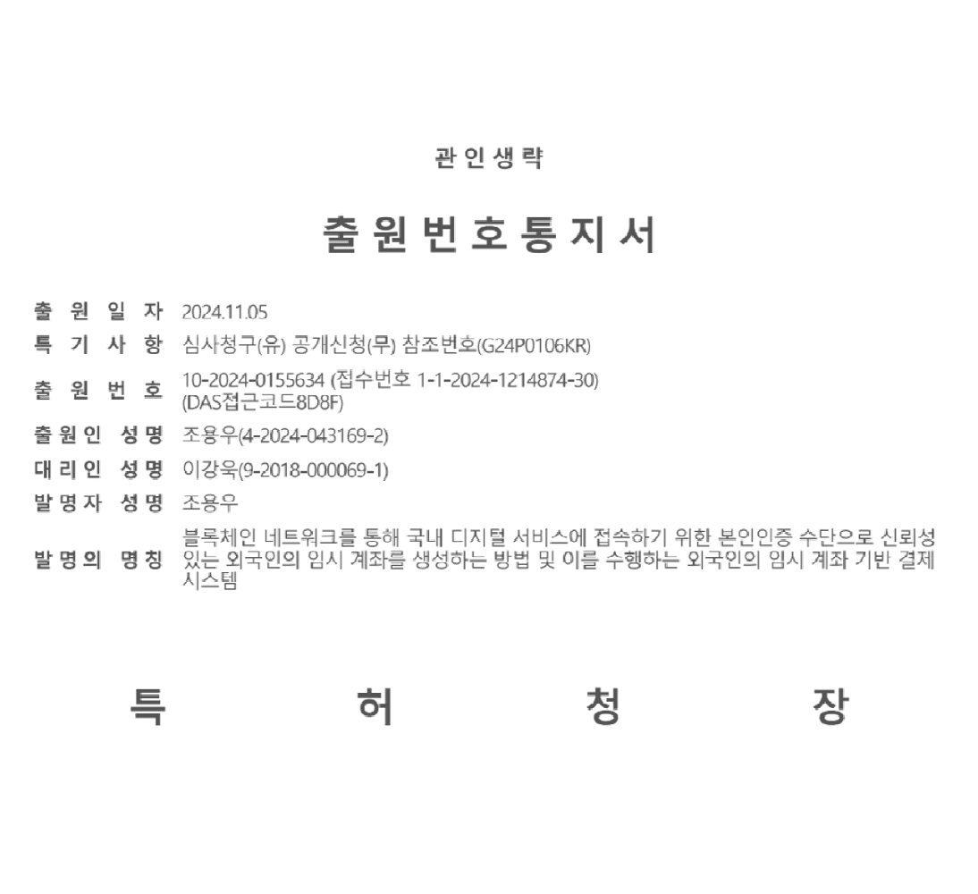 명칭 : 블록체인 네트워크를 통해 국내 디지털 서비스에 접속하기 위한 본인인증 수단으로 신뢰성있는 외국인의 임시 계좌를 생성하는 방법 및 이를 수행하는 외국인의 임시 계좌 기반 결제 시스템